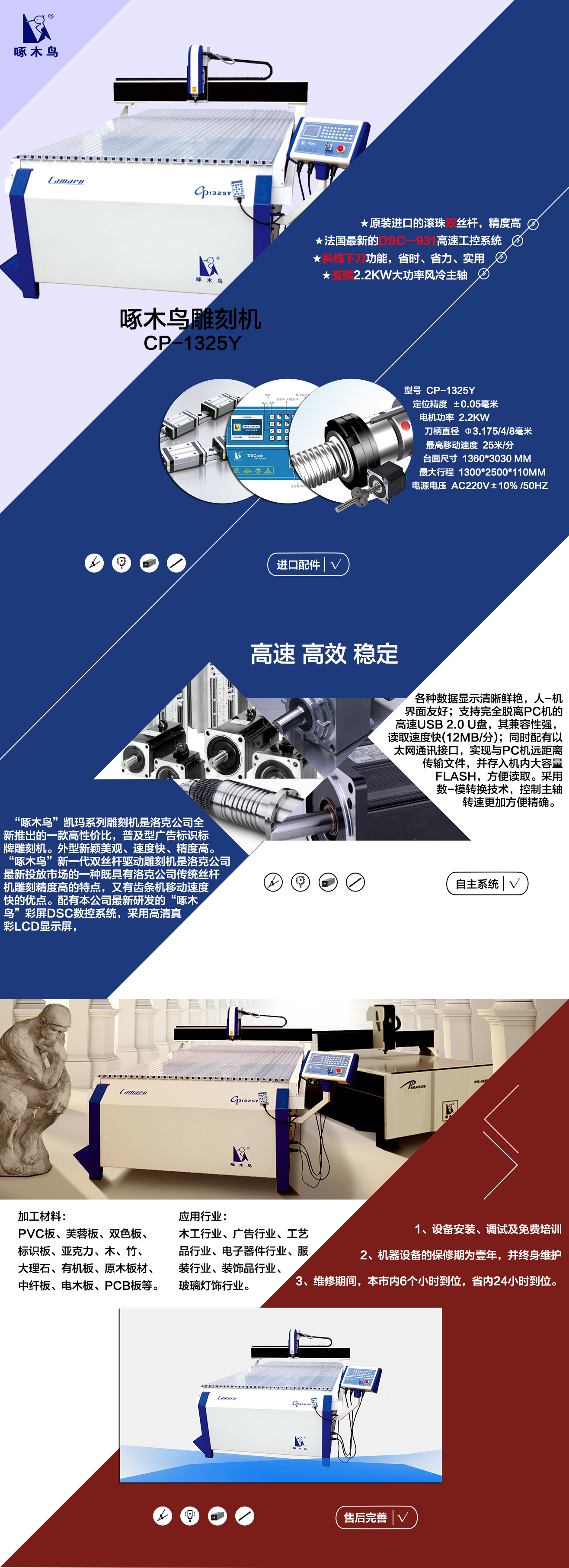 “啄木鳥”凱瑪系列雕刻機是洛克公司全新(xīn)推出的一(yī)款高性價比,普及型廣告标識标牌雕刻機。外型新(xīn)穎美觀、速度快(kuài)、精度高。“啄木鳥”新(xīn)一(yī)代雙絲杆驅動雕刻機是洛克公司最新(xīn)投放(fàng)市(shì)場(chǎng)的一(yī)種既具有洛克公司傳統絲杆機雕刻精度高的特點,又有齒條機移動速度快(kuài)的優點。配有本公司最新(xīn)研發的“啄木鳥”彩屏DSC數控系統,采用高清真彩LCD顯示屏,各種數據顯示清晰鮮豔,人(rén)-機界面友好(hǎo)(hǎo);支持完全脫離PC機的高速USB 2.0 U盤,其兼容性強,讀取速度快(kuài)(12MB/分(fēn));同時(shí)配有以太網通訊接口,實現(xiàn)與PC機遠(yuǎn)距離傳輸文件,并存入機内大容量Flash,方便讀取。采用數-模轉換技術,控制主軸轉速更加方便精确。